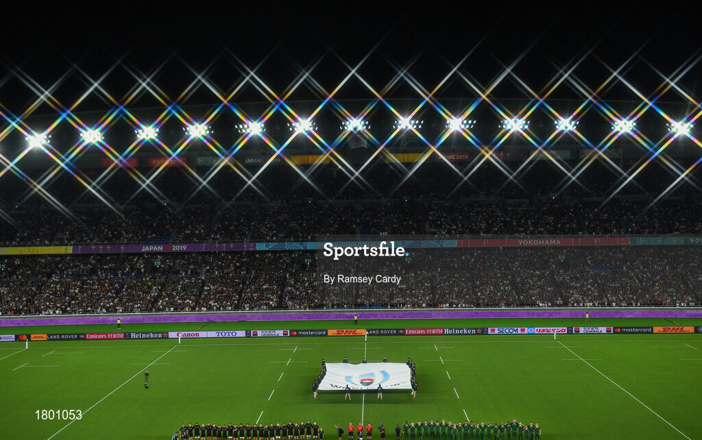 21 September 2019; Both teams during the national anthems prior to the 2019 Rugby World Cup Pool B match between New Zealand and South Africa at the International Stadium in Yokohama, Japan. Photo by Ramsey Cardy/Sportsfile