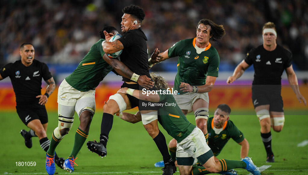21 September 2019; Ardie Savea of New Zealand is tackled by Siya Kolisi of South Africa left, and, Faf de Klerk of South Africa right, during the 2019 Rugby World Cup Pool B match between New Zealand and South Africa at the International Stadium in Yokohama, Japan. Photo by Ramsey Cardy/Sportsfile