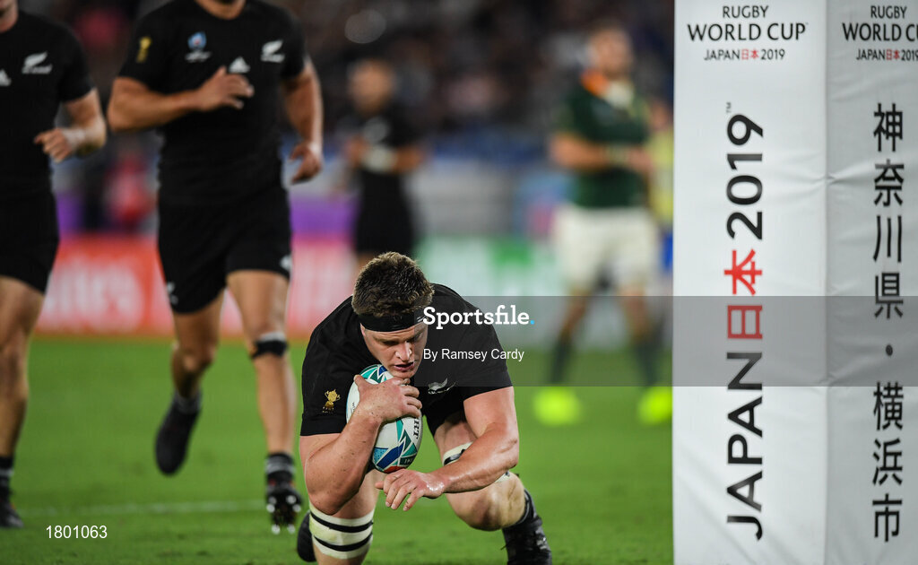 21 September 2019; Scott Barrett of New Zealand scores a second try for his side during the 2019 Rugby World Cup Pool B match between New Zealand and South Africa at the International Stadium in Yokohama, Japan. Photo by Ramsey Cardy/Sportsfile