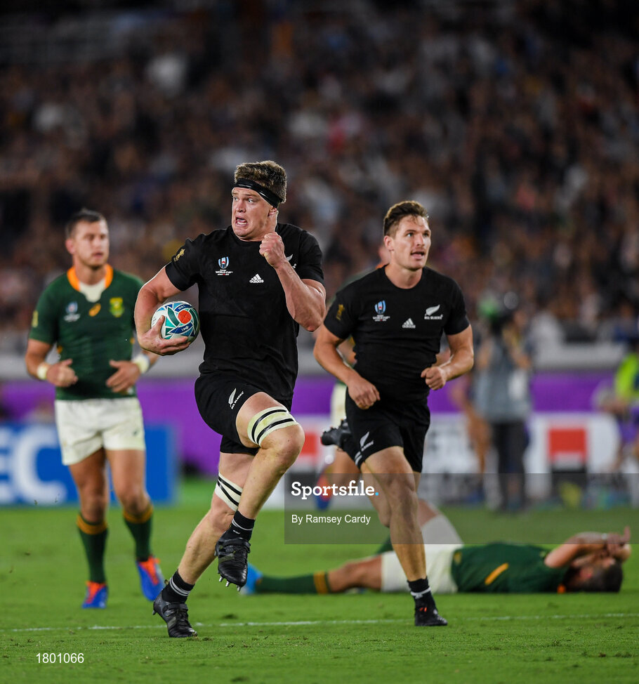21 September 2019; Scott Barrett of New Zealand on his way to scoring his side's second try during the 2019 Rugby World Cup Pool B match between New Zealand and South Africa at the International Stadium in Yokohama, Japan. Photo by Ramsey Cardy/Sportsfile