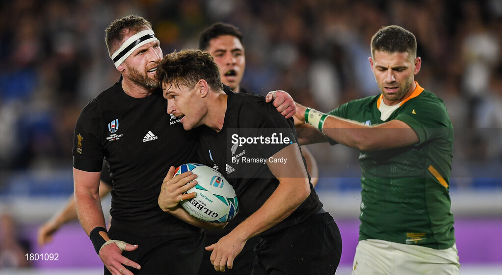 21 September 2019; George Bridge of New Zealand is congratulated by new Zealand captain Kieran Read, during the 2019 Rugby World Cup Pool B match between New Zealand and South Africa at the International Stadium in Yokohama, Japan. Photo by Ramsey Cardy/Sportsfile
