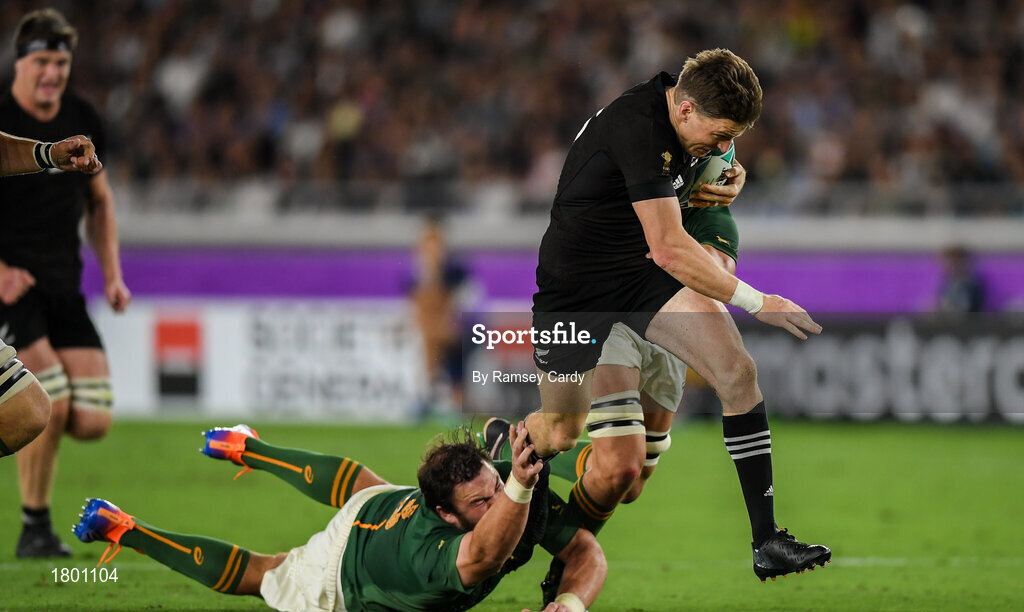 21 September 2019; Beauden Barrett of New Zealand is tackled by Frans Malherbe of South Africa during the 2019 Rugby World Cup Pool B match between New Zealand and South Africa at the International Stadium in Yokohama, Japan. Photo by Ramsey Cardy/Sportsfile