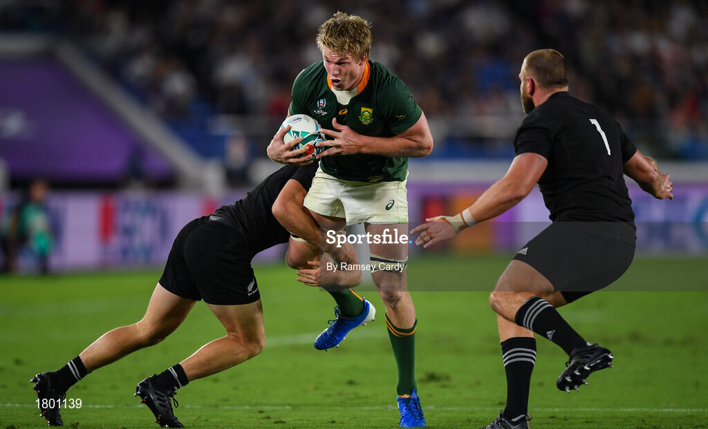 21 September 2019; Pieter-Steph du Toit of South Africa is tackled by George Bridge of New Zealand during the 2019 Rugby World Cup Pool B match between New Zealand and South Africa at the International Stadium in Yokohama, Japan. Photo by Ramsey Cardy/Sportsfile