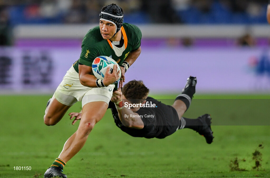 21 September 2019; Cheslin Kolbe of South Africa is tackled by Beauden Barrett of New Zealand during the 2019 Rugby World Cup Pool B match between New Zealand and South Africa at the International Stadium in Yokohama, Japan. Photo by Ramsey Cardy/Sportsfile