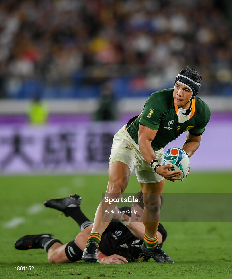 21 September 2019; Cheslin Kolbe of South Africa is tackled by Beauden Barrett of New Zealand during the 2019 Rugby World Cup Pool B match between New Zealand and South Africa at the International Stadium in Yokohama, Japan. Photo by Ramsey Cardy/Sportsfile