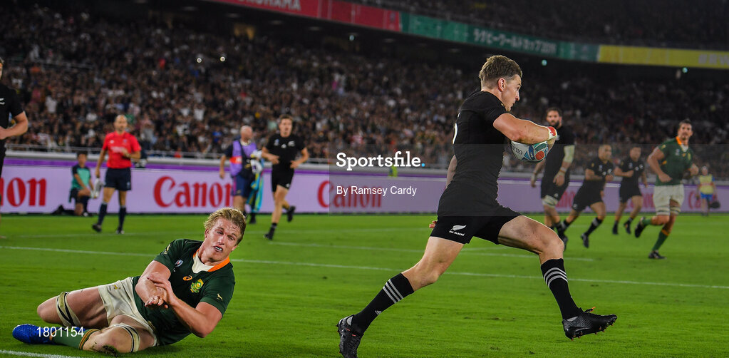 21 September 2019; Beauden Barrett of New Zealand avades the tackle of Pieter-Steph du Toit of South Africa during the 2019 Rugby World Cup Pool B match between New Zealand and South Africa at the International Stadium in Yokohama, Japan. Photo by Ramsey Cardy/Sportsfile