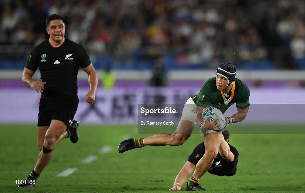 21 September 2019; Cheslin Kolbe of South Africa is tackled by Beauden Barrett of New Zealand during the 2019 Rugby World Cup Pool B match between New Zealand and South Africa at the International Stadium in Yokohama, Japan. Photo by Ramsey Cardy/Sportsfile