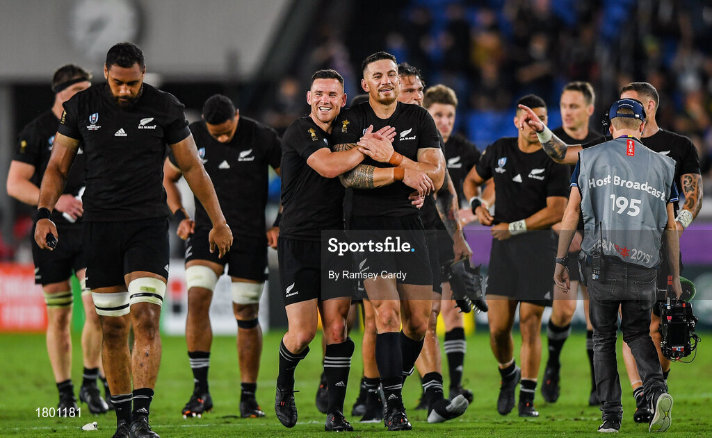 21 September 2019; New Zealand players following their victory in the 2019 Rugby World Cup Pool B match between New Zealand and South Africa at the International Stadium in Yokohama, Japan. Photo by Ramsey Cardy/Sportsfile