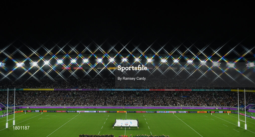 21 September 2019; The teams during the national anthems prior to the 2019 Rugby World Cup Pool B match between New Zealand and South Africa at the International Stadium in Yokohama, Japan. Photo by Ramsey Cardy/Sportsfile