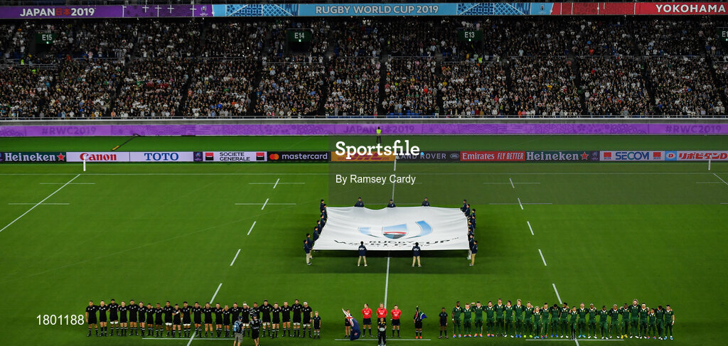 21 September 2019; The teams during the national anthems prior to the 2019 Rugby World Cup Pool B match between New Zealand and South Africa at the International Stadium in Yokohama, Japan. Photo by Ramsey Cardy/Sportsfile