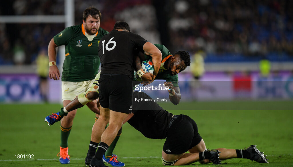 21 September 2019; Siya Kolisi of South Africa is tackled by Codie Taylor of New Zealand left, and Scott Barrett of New Zealand right, during the 2019 Rugby World Cup Pool B match between New Zealand and South Africa at the International Stadium in Yokohama, Japan. Photo by Ramsey Cardy/Sportsfile