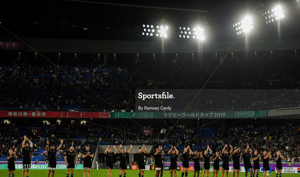 21 September 2019; The New Zealand team applauds supporters following the 2019 Rugby World Cup Pool B match between New Zealand and South Africa at the International Stadium in Yokohama, Japan. Photo by Ramsey Cardy/Sportsfile