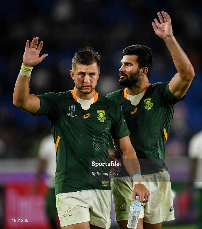21 September 2019; Handré Pollard, left, and Damian de Allende, right, of South Africa following their defeat in the 2019 Rugby World Cup Pool B match between New Zealand and South Africa at the International Stadium in Yokohama, Japan. Photo by Ramsey Cardy/Sportsfile