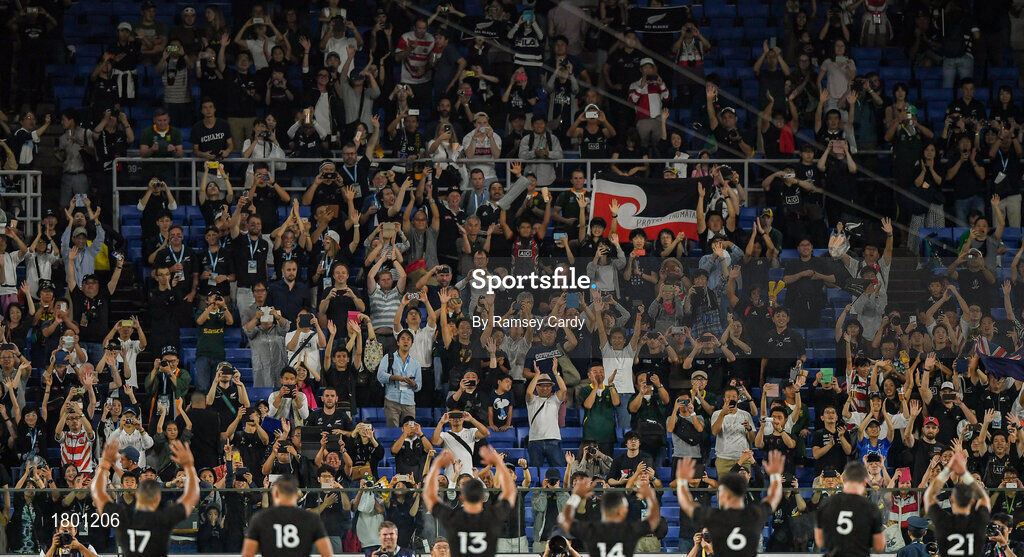 21 September 2019; The New Zealand team are applauded by supporters following the 2019 Rugby World Cup Pool B match between New Zealand and South Africa at the International Stadium in Yokohama, Japan. Photo by Ramsey Cardy/Sportsfile