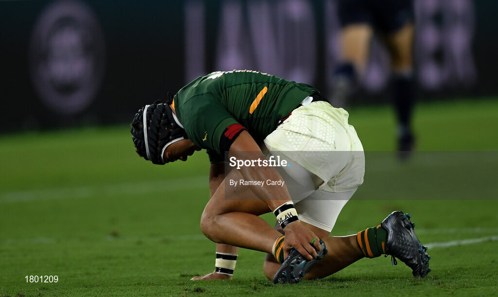 21 September 2019; Cheslin Kolbe of South Africa after picking up an injury during the 2019 Rugby World Cup Pool B match between New Zealand and South Africa at the International Stadium in Yokohama, Japan. Photo by Ramsey Cardy/Sportsfile