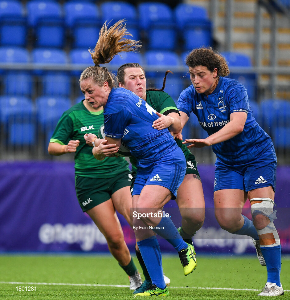 21 September 2019; Elise O'Byrne White of Leinster is tackled by Shannon Touhey of Connacht during the Women's Interprovincial Championship Final match between Leinster and Connacht at Energia Park in Donnybrook, Dublin. Photo by Eóin Noonan/Sportsfile
