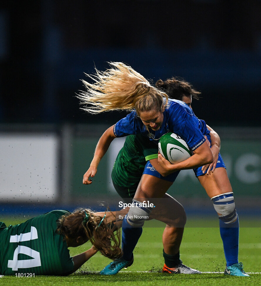 21 September 2019; Megan Williams of Leinster is tackled by Beibhinn Parsons, left, and Mary Healy of Connacht during the Women's Interprovincial Championship Final match between Leinster and Connacht at Energia Park in Donnybrook, Dublin. Photo by Eóin Noonan/Sportsfile