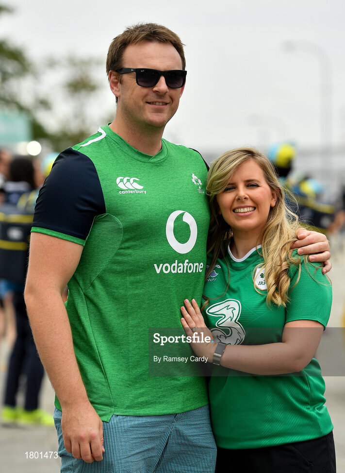 22 September 2019; Ireland supporters Shane O'Leary and Therese Philbin, from Naas, Kildare, ahead of the 2019 Rugby World Cup Pool A match between Ireland and Scotland at the International Stadium in Yokohama, Japan. Photo by Ramsey Cardy/Sportsfile