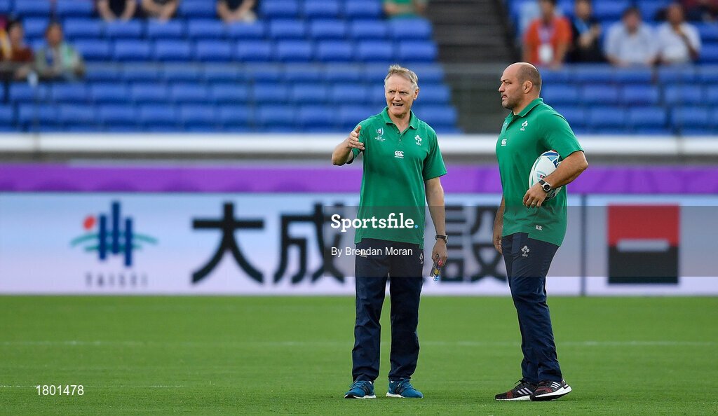 22 September 2019; Ireland head coach Joe Schmidt and captain Rory Best prior to the 2019 Rugby World Cup Pool A match between Ireland and Scotland at the International Stadium in Yokohama, Japan. Photo by Brendan Moran/Sportsfile