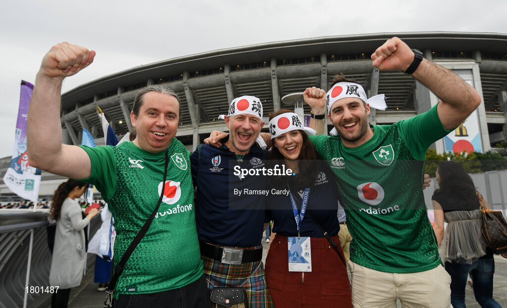 22 September 2019; Supporters, from left, Nigel Hughes, Derek and Faye Anderson, and Liam Quinn ahead of the 2019 Rugby World Cup Pool A match between Ireland and Scotland at the International Stadium in Yokohama, Japan. Photo by Ramsey Cardy/Sportsfile