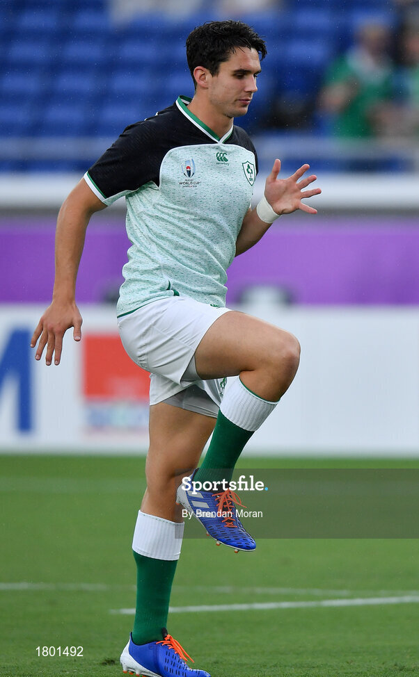 22 September 2019; Ireland's Joey Carbery warms up prior to the 2019 Rugby World Cup Pool A match between Ireland and Scotland at the International Stadium in Yokohama, Japan. Photo by Brendan Moran/Sportsfile