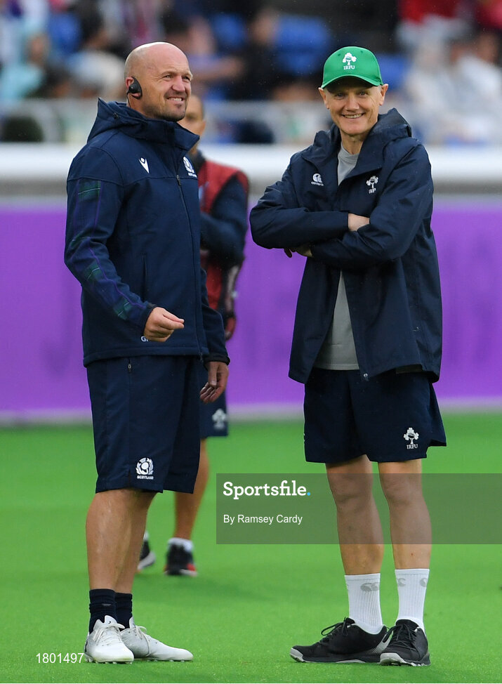 22 September 2019; Scotland head coach Gregor Townsend, left, and Ireland head coach Joe Schmidt prior to the 2019 Rugby World Cup Pool A match between Ireland and Scotland at the International Stadium in Yokohama, Japan. Photo by Ramsey Cardy/Sportsfile