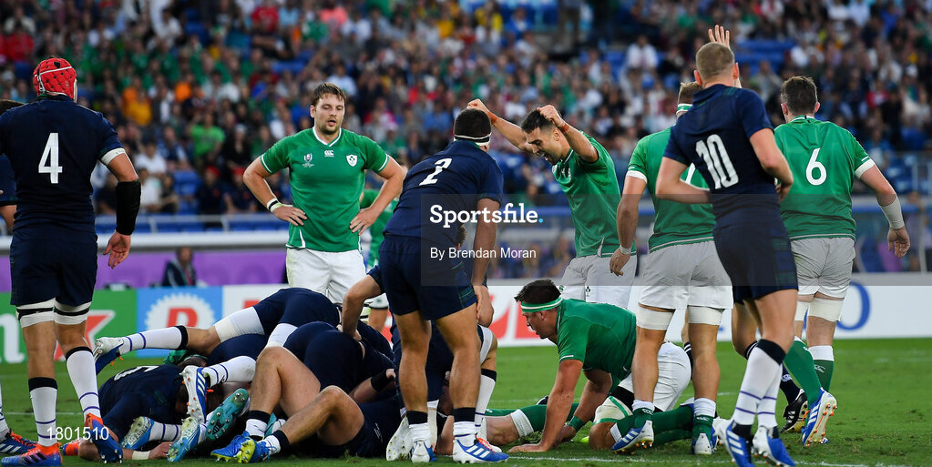 22 September 2019; Conor Murray celebrates after his Ireland team-mate James Ryan, hidden, scored their opening try during the 2019 Rugby World Cup Pool A match between Ireland and Scotland at the International Stadium in Yokohama, Japan. Photo by Brendan Moran/Sportsfile