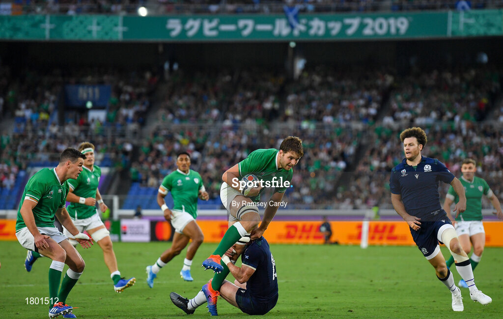 22 September 2019; Iain Henderson of Ireland is tackled by Stuart Hogg of Scotland during the 2019 Rugby World Cup Pool A match between Ireland and Scotland at the International Stadium in Yokohama, Japan. Photo by Ramsey Cardy/Sportsfile