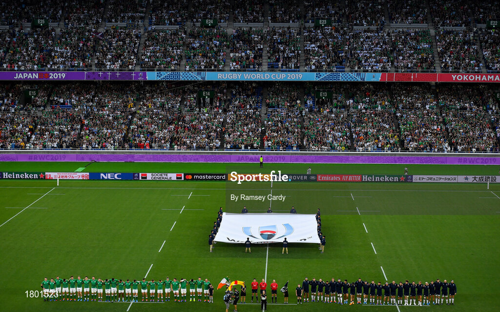 22 September 2019; Players and match officials during the playing of the anthems prior to the 2019 Rugby World Cup Pool A match between Ireland and Scotland at the International Stadium in Yokohama, Japan. Photo by Ramsey Cardy/Sportsfile
