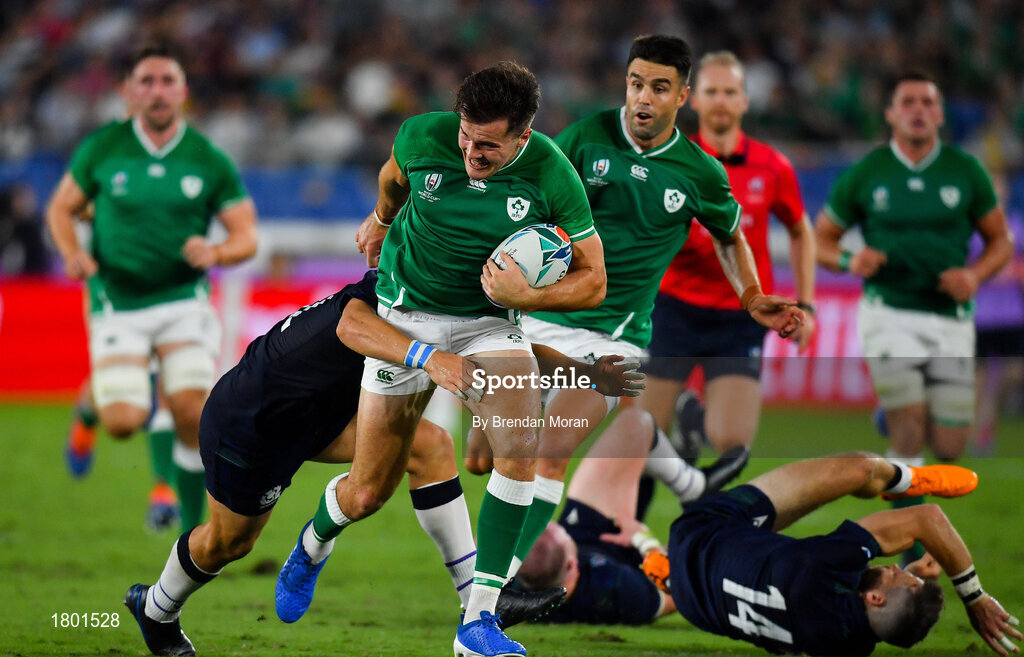 22 September 2019; Jacob Stockdale of Ireland is tackled by Sam Johnson of Scotland during the 2019 Rugby World Cup Pool A match between Ireland and Scotland at the International Stadium in Yokohama, Japan. Photo by Brendan Moran/Sportsfile