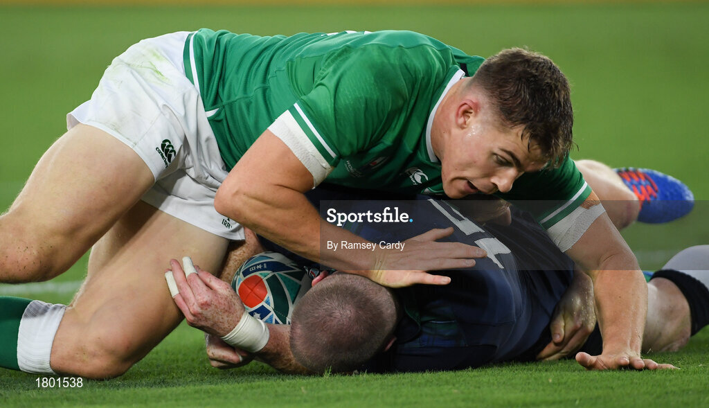 22 September 2019; Stuart Hogg of Scotland is tackled by Garry Ringrose of Ireland during the 2019 Rugby World Cup Pool A match between Ireland and Scotland at the International Stadium in Yokohama, Japan. Photo by Ramsey Cardy/Sportsfile