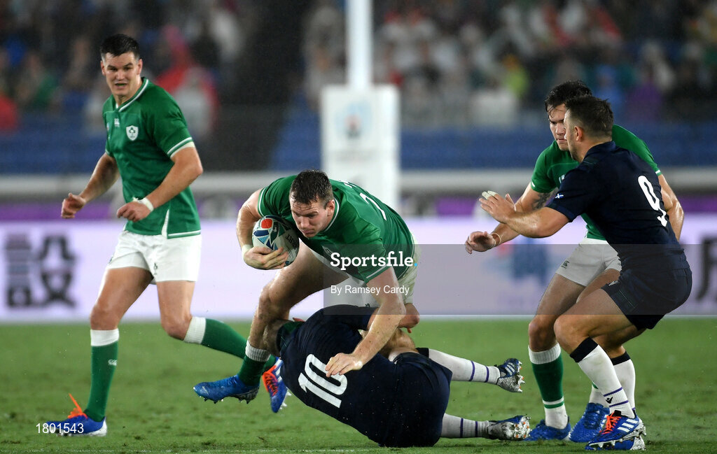 22 September 2019; Chris Farrell of Ireland is tackled by Finn Russell of Scotland during the 2019 Rugby World Cup Pool A match between Ireland and Scotland at the International Stadium in Yokohama, Japan. Photo by Ramsey Cardy/Sportsfile