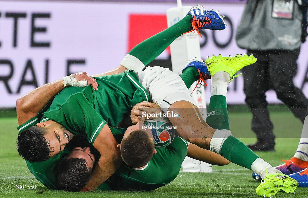 22 September 2019; Andrew Conway, right, is congratulated by his Ireland team-mates Conor Murray, top, and Jonathan Sexton, after scoring their side's fourth try during the 2019 Rugby World Cup Pool A match between Ireland and Scotland at the International Stadium in Yokohama, Japan. Photo by Brendan Moran/Sportsfile