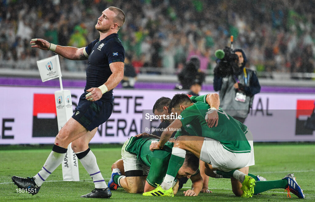 22 September 2019; Andrew Conway is congratulated by his Ireland team-mates Conor Murray, right, and Jonathan Sexton after scoring their side's fourth try during the 2019 Rugby World Cup Pool A match between Ireland and Scotland at the International Stadium in Yokohama, Japan. Photo by Brendan Moran/Sportsfile