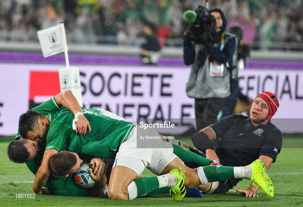 22 September 2019; Andrew Conway is congratulated by his Ireland team-mates Conor Murray, top, and Jonathan Sexton, left, after scoring their side's fourth try during the 2019 Rugby World Cup Pool A match between Ireland and Scotland at the International Stadium in Yokohama, Japan. Photo by Brendan Moran/Sportsfile