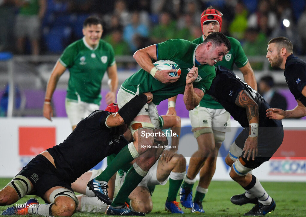 22 September 2019; James Ryan of Ireland is tackled by Grant Gilchrist, left, and Blade Thomson of Scotland during the 2019 Rugby World Cup Pool A match between Ireland and Scotland at the International Stadium in Yokohama, Japan. Photo by Brendan Moran/Sportsfile