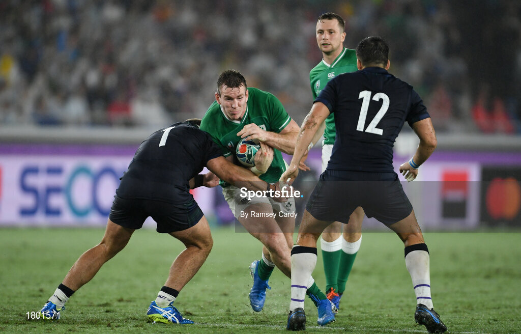 22 September 2019; Chris Farrell of Ireland is tackled by Allan Dell of Scotland during the 2019 Rugby World Cup Pool A match between Ireland and Scotland at the International Stadium in Yokohama, Japan. Photo by Ramsey Cardy/Sportsfile