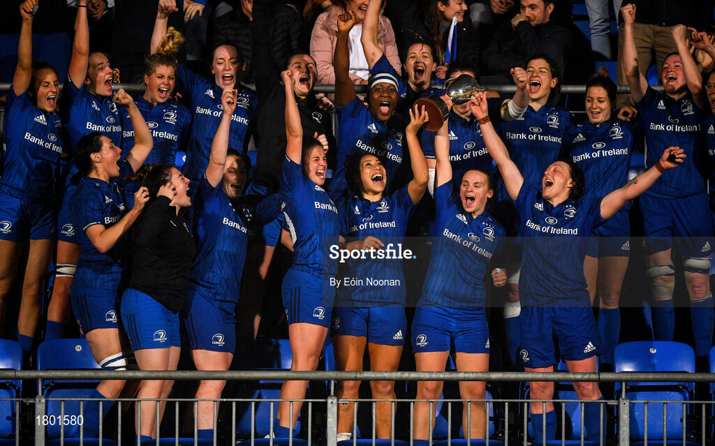 21 September 2019; Leinster captain Sene Naoupu lifting the cup with team-mates following the Women's Interprovincial Championship Final match between Leinster and Connacht at Energia Park in Donnybrook, Dublin. Photo by Eóin Noonan/Sportsfile