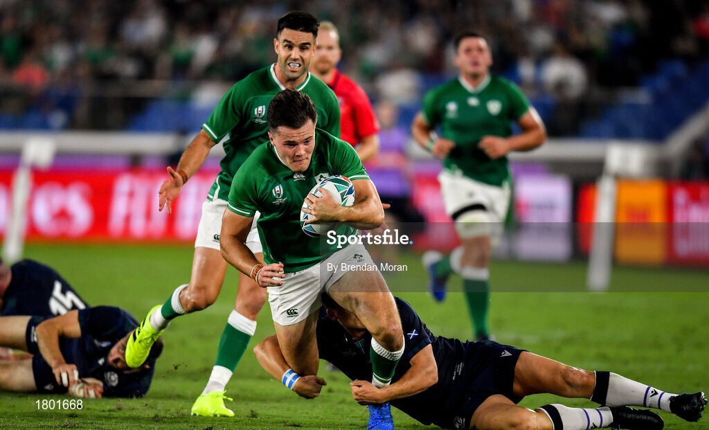 22 September 2019; Jacob Stockdale of Ireland is tackled by Sam Johnson of Scotland during the 2019 Rugby World Cup Pool A match between Ireland and Scotland at the International Stadium in Yokohama, Japan. Photo by Brendan Moran/Sportsfile