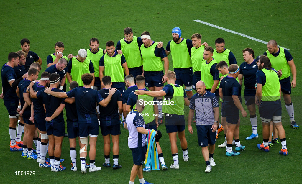 22 September 2019; The Scotland team huddle ahead of the 2019 Rugby World Cup Pool A match between Ireland and Scotland at the International Stadium in Yokohama, Japan. Photo by Ramsey Cardy/Sportsfile