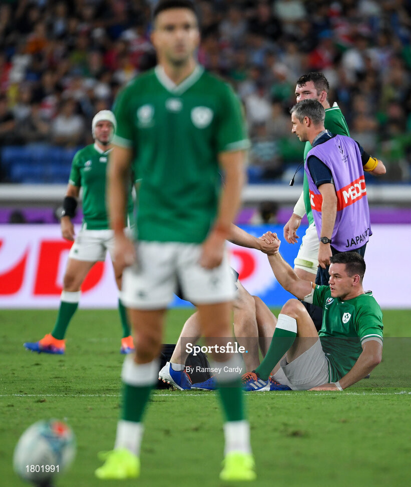 22 September 2019; Peter O’Mahony of Ireland leaves the pitch with an injury, as team-mate Jonathan Sexton is treated for an injury, and Conor Murray prepares to kick a conversion during the 2019 Rugby World Cup Pool A match between Ireland and Scotland at the International Stadium in Yokohama, Japan. Photo by Ramsey Cardy/Sportsfile