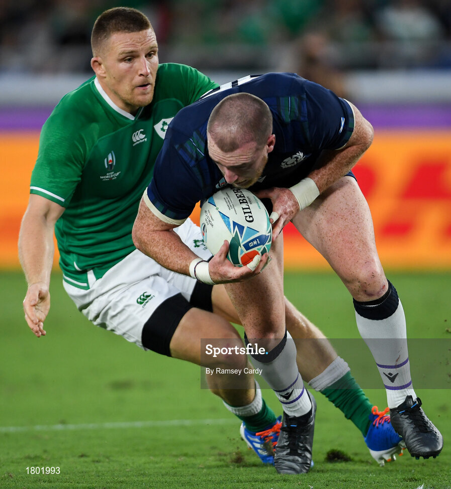 22 September 2019; Stuart Hogg of Scotland in action against Andrew Conway of Ireland during the 2019 Rugby World Cup Pool A match between Ireland and Scotland at the International Stadium in Yokohama, Japan. Photo by Ramsey Cardy/Sportsfile