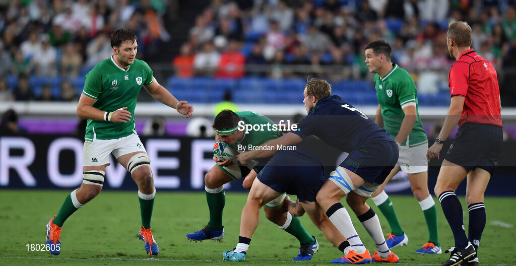 22 September 2019; CJ Stander of Ireland is tackled by Jonny Gray of Scotland during the 2019 Rugby World Cup Pool A match between Ireland and Scotland at the International Stadium in Yokohama, Japan. Photo by Brendan Moran/Sportsfile