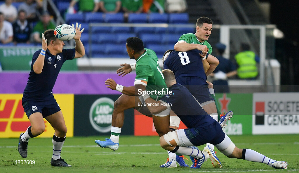 22 September 2019; Jonathan Sexton of Ireland is tackled off the ball by Ryan Wilson of Scotland during the 2019 Rugby World Cup Pool A match between Ireland and Scotland at the International Stadium in Yokohama, Japan. Photo by Brendan Moran/Sportsfile