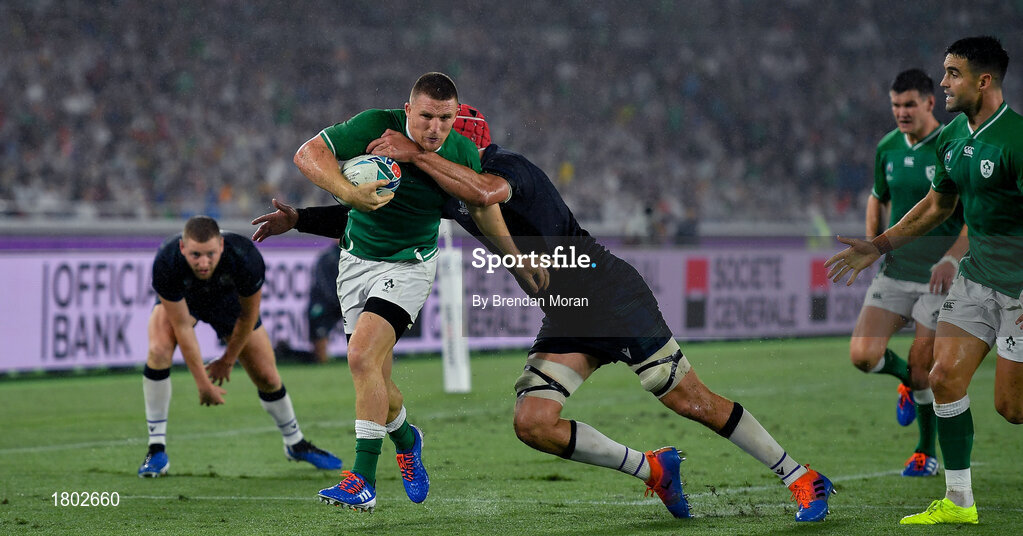 22 September 2019; Andrew Conway of Ireland is tackled by Grant Gilchrist of Scotland on the way to scroing his side's fourth try during the 2019 Rugby World Cup Pool A match between Ireland and Scotland at the International Stadium in Yokohama, Japan. Photo by Brendan Moran/Sportsfile