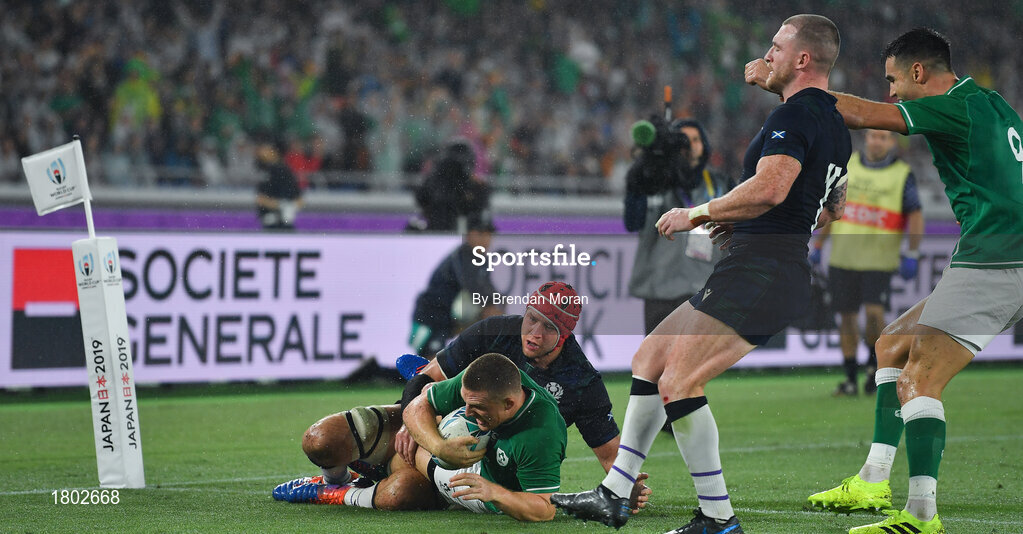 22 September 2019; Andrew Conway of Ireland scores his side's fourth try during the 2019 Rugby World Cup Pool A match between Ireland and Scotland at the International Stadium in Yokohama, Japan. Photo by Brendan Moran/Sportsfile