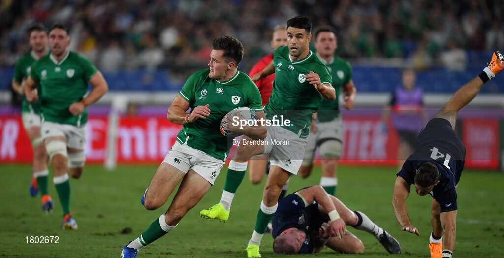 22 September 2019; Jacob Stockdale of Ireland escapes the tackle of Stuart Hogg of Scotland during the 2019 Rugby World Cup Pool A match between Ireland and Scotland at the International Stadium in Yokohama, Japan. Photo by Brendan Moran/Sportsfile