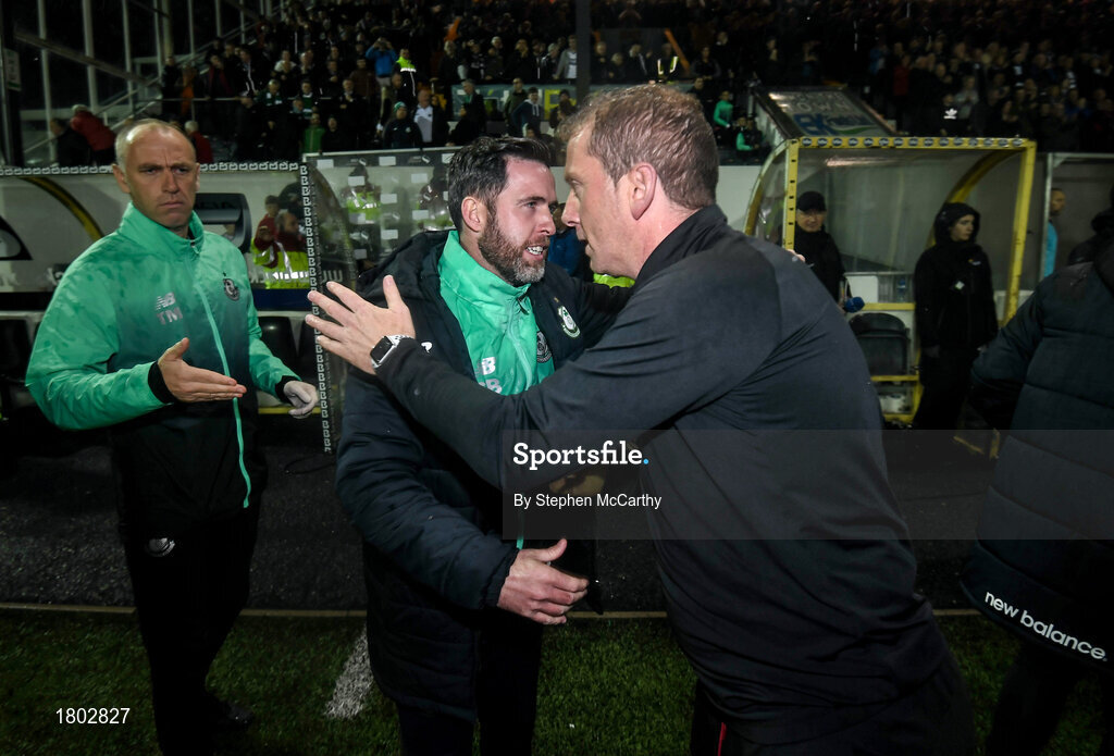23 September 2019; Shamrock Rovers manager Stephen Bradley and Dundalk head coach Vinny Perth following the SSE Airtricity League Premier Division match between Dundalk and Shamrock Rovers at Oriel Park in Dundalk, Co Louth. Photo by Stephen McCarthy/Sportsfile