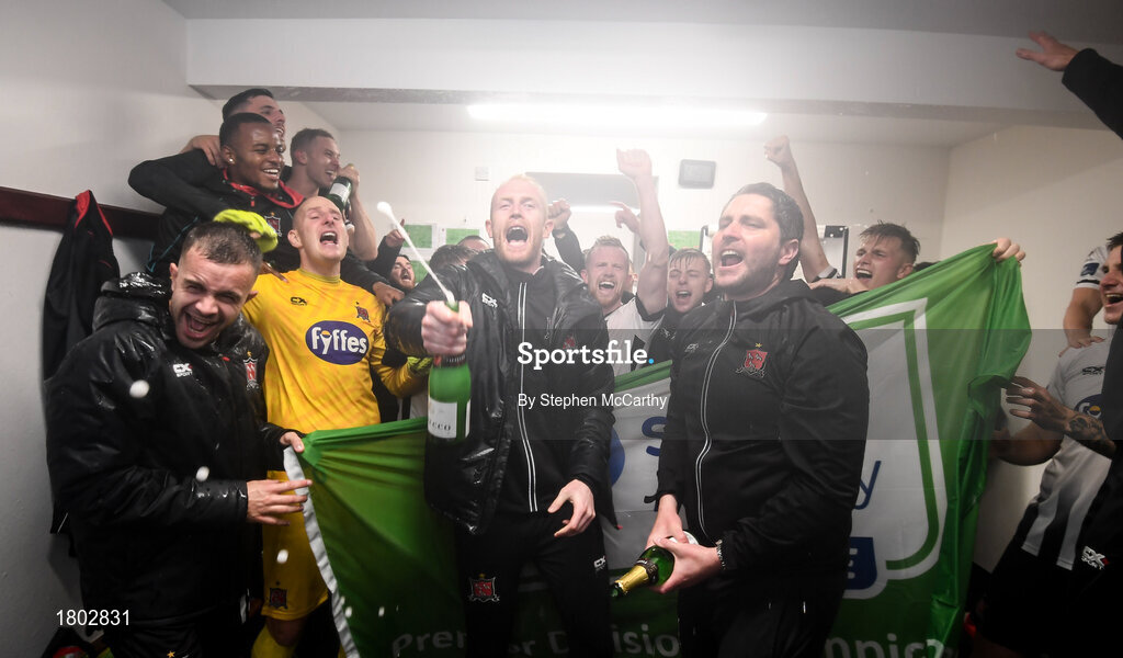 23 September 2019; Dundalk players, including Robbie Benson, Gary Rogers, Aaron McCarey and assistant head coach Ruaidhri Higgins celebrate winning the SSE Airtricity League Premier Division following their match against Shamrock Rovers at Oriel Park in Dundalk, Co Louth. Photo by Stephen McCarthy/Sportsfile