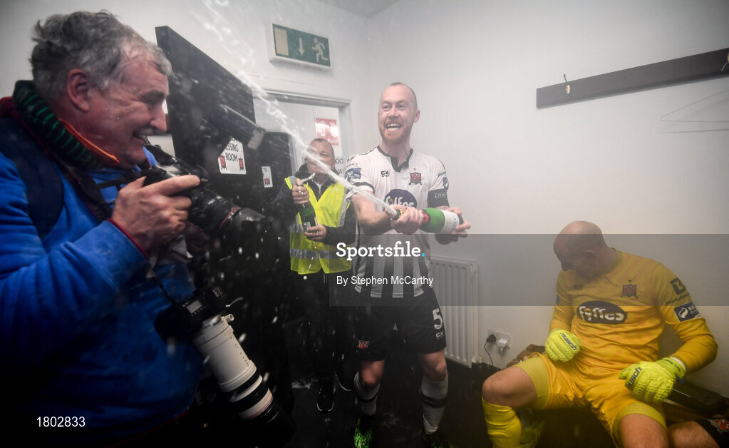 23 September 2019; Chris Shields of Dundalk celebrates winning the SSE Airtricity League Premier Division following their match against Shamrock Rovers at Oriel Park in Dundalk, Co Louth. Photo by Stephen McCarthy/Sportsfile